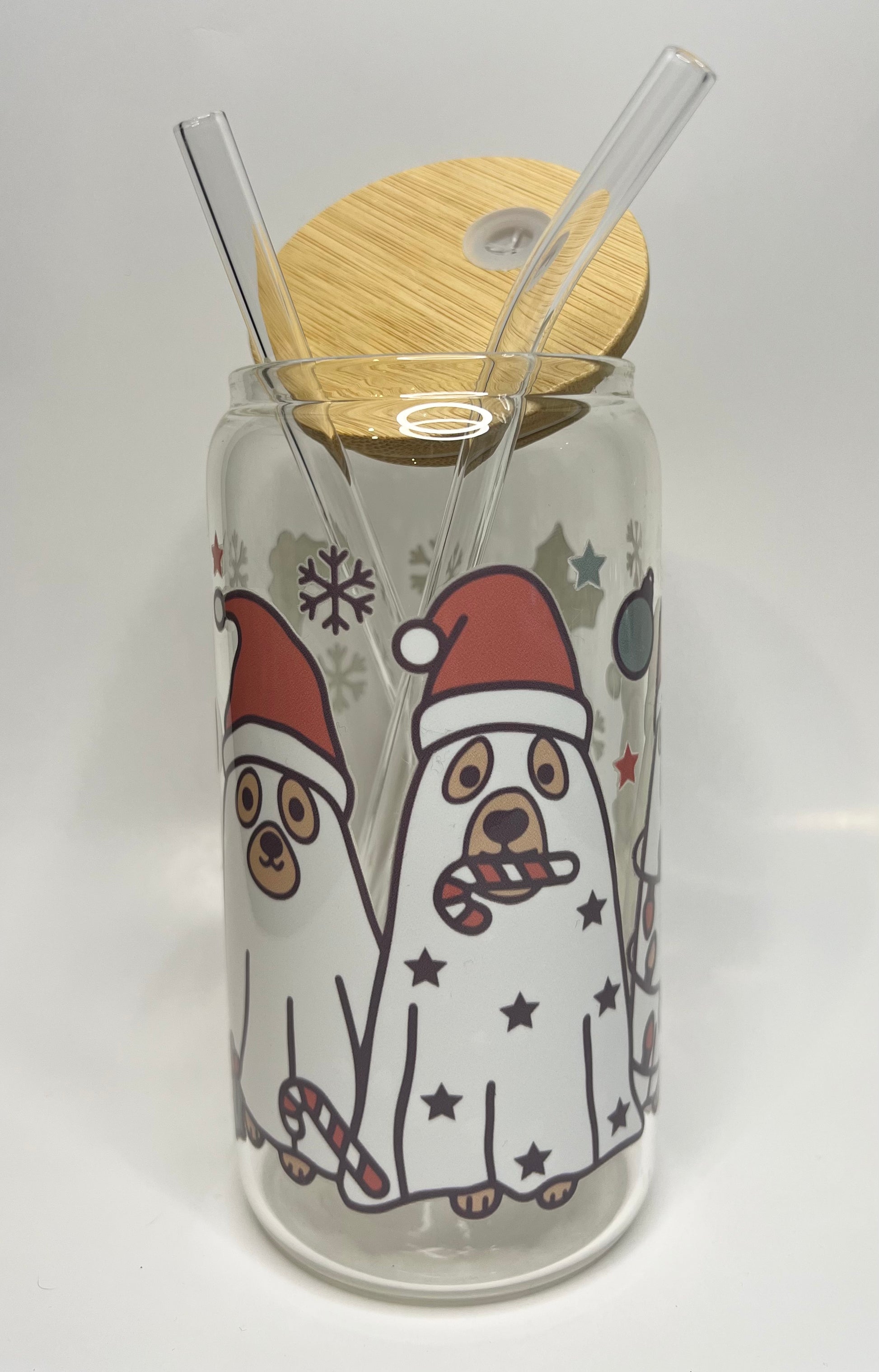 Enjoy a chilled beverage with this 16 oz. Ghost Pup Glass Cup. Includes two glass straws for convenient on-the-go sipping and a bamboo lid.